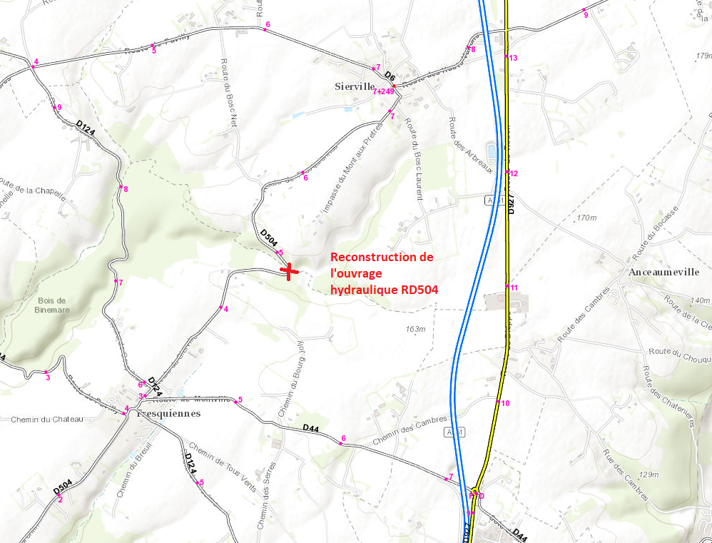 Le département, dans son programme de travaux sur ouvrages d’arts, prévoit le remplacement de l’ouvrage de traversée hydraulique de la RD504 situé à mi-chemin entre les communes de Sierville et de Fresquiennes.