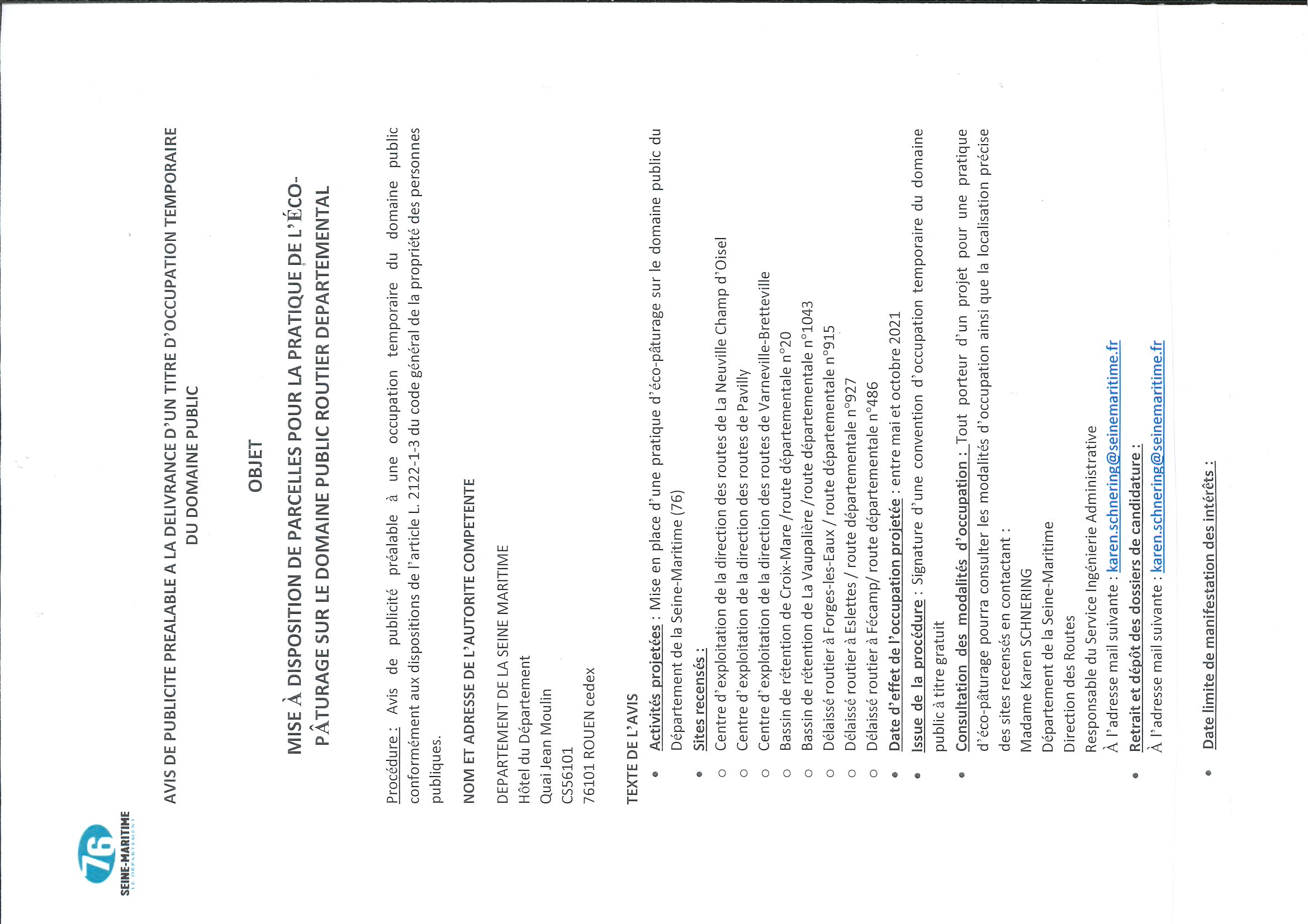 Tout porteur d’un projet pour une pratique d’éco-pâturage pourra consulter les modalités d’occupation, la localisation précise des sites recensés, retirer et déposer son dossier de candidature en contactant Madame Karen SCHNERING à l’adresse mail suivante : karen.schnering@seinemaritime.fr